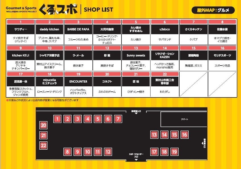 体を動かしたあとは会場の外に出て、美味しいグルメを味わったり、ちょっとしたお買い物をしてひとやすみ。
