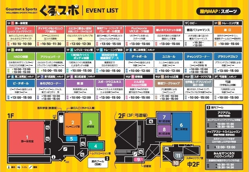 会場を「ぐるぐる」巡り、色々なスポーツに触れたり、グルメを楽しめます。